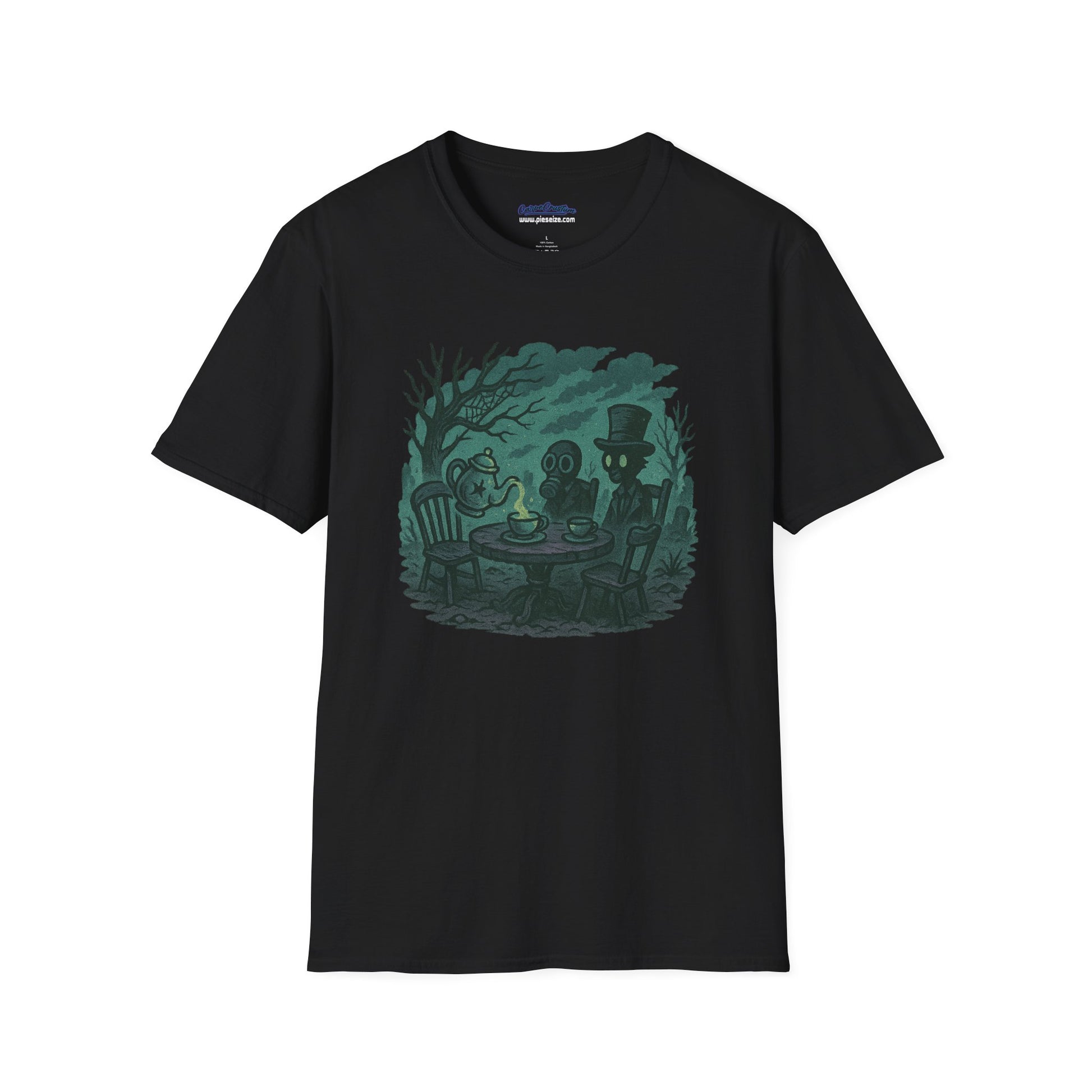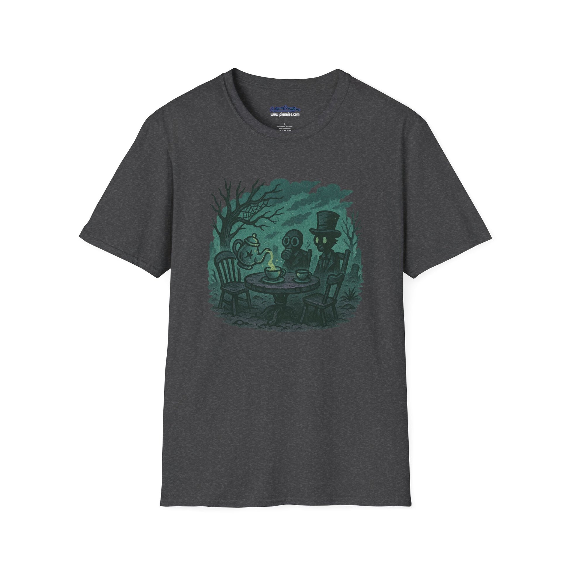 🎩☠️ Who says the end of the world can’t be classy? Introducing the Apocalyptic Tea Party Tee – a delightfully twisted blend of Victorian manners and radioactive madness. This shirt features two gas mask-wearing ghouls casually sipping tea in a haunted forest like it's just another Tuesday after doomsday.