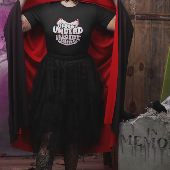 A vampire-themed gothic T-shirt designed for those who embrace the undead, perfect for adding a dark and mysterious vibe to any outfit. Ideal for fans of gothic fashion and those looking to make a statement during Halloween or goth events.